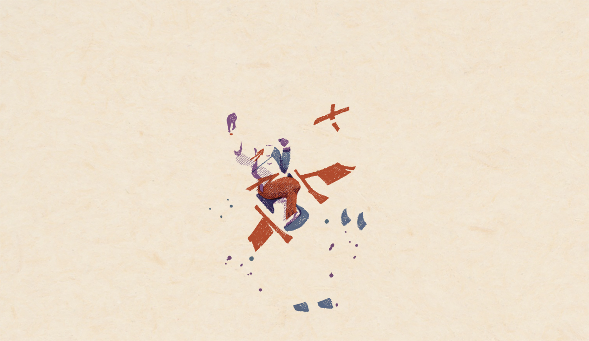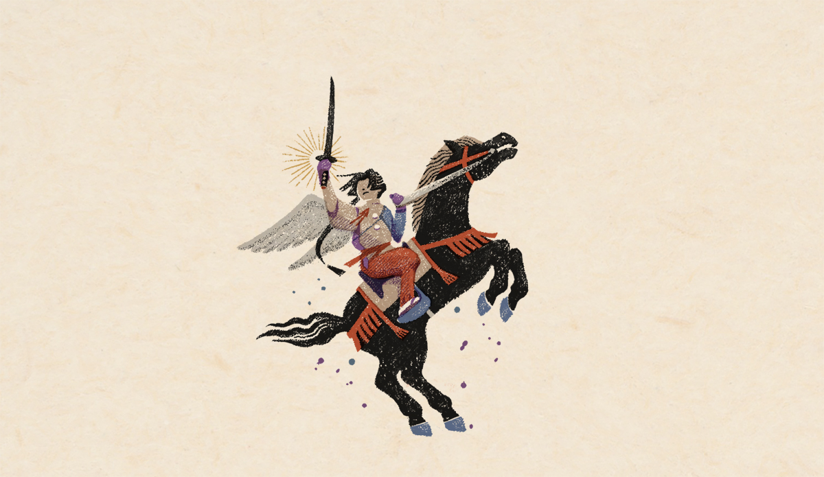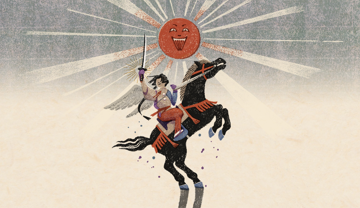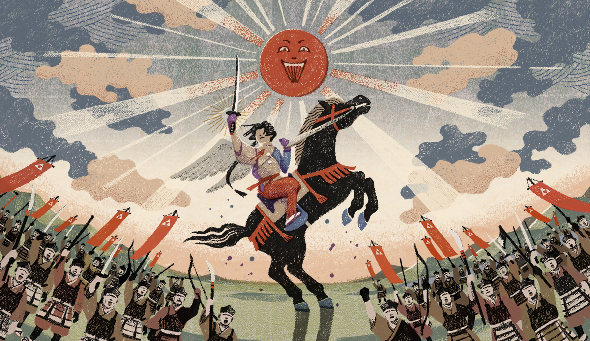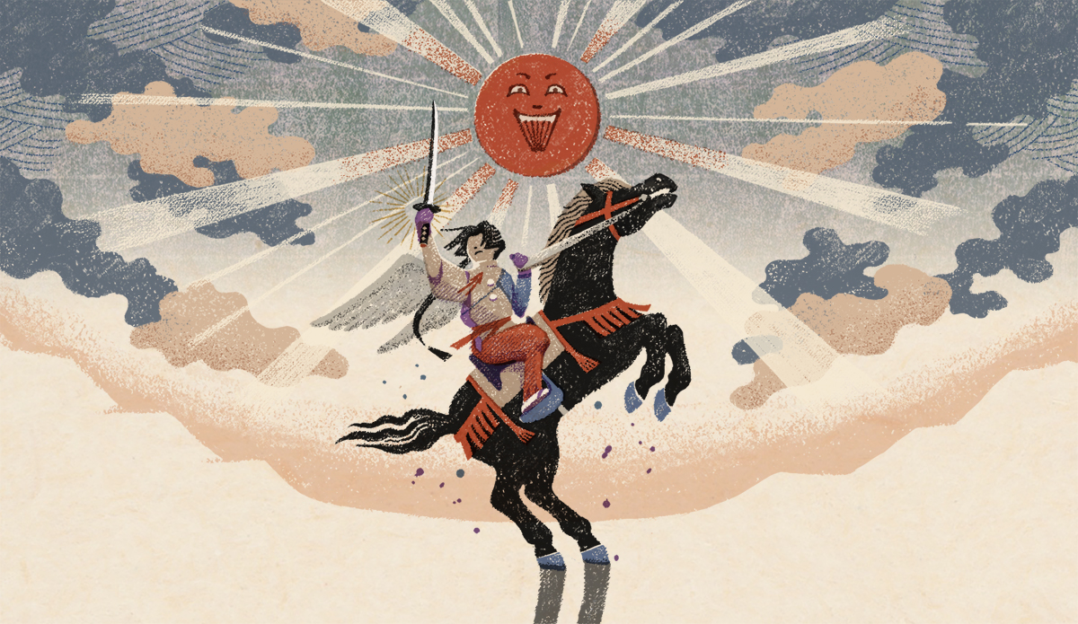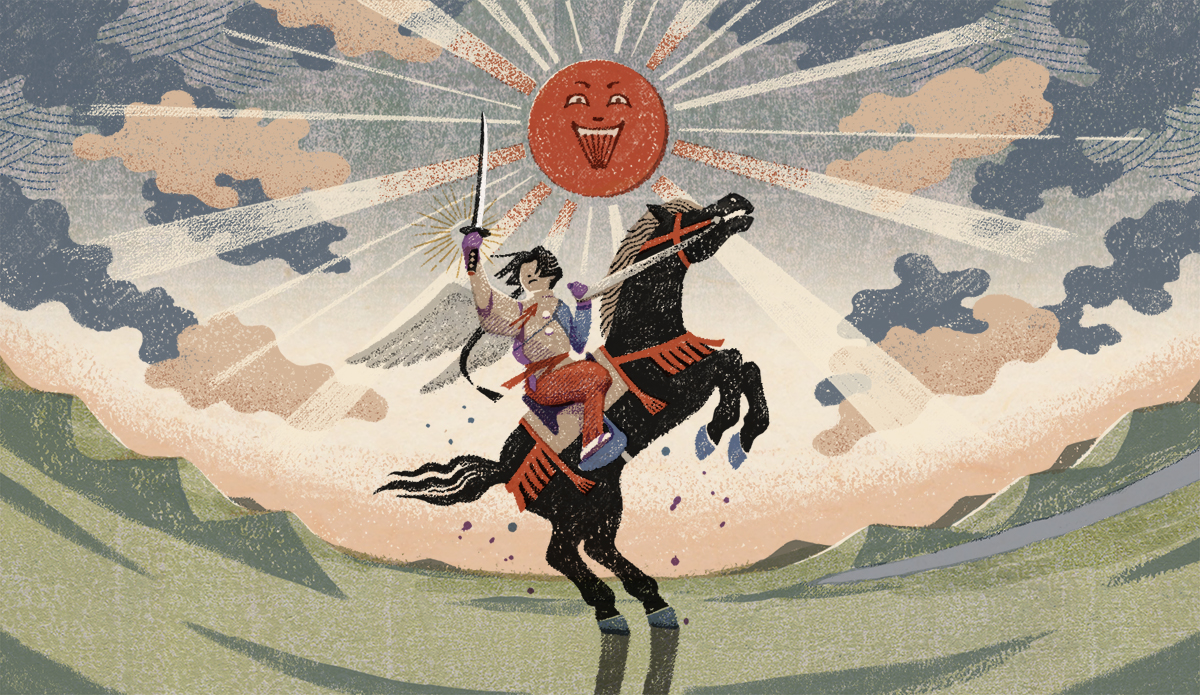 私がイラストを提供した第3話「神の住む森」は逃げ延びた時行一行が諏訪大社に辿り着き、新天地で決意を固める重要な回。諏訪頼重が時行を説き伏せるシーンを、版を重ねて徐々に出来ていく版画のようなイメージで作っています。1、2話で描かれた辛い境遇から、光を見出すような展開を表現できれば、と思いながら制作しました。